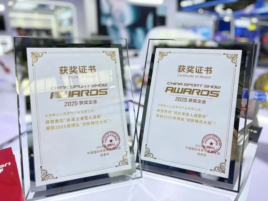 在这次评选中金沙js93252人造草坪的流彩渐变人造草坪产品,也获得中国体博会创新推优-中国制造之美专项奖”金奖。流彩人造草坪是一款突破传统的新型艺术草坪,采用独特工艺实现色彩渐变效果,使图案呈现立体三维观感,兼具实用功能和艺术价值。相比普通人造草坪,它能逼真还原油画、国画等艺术风格,适用于运动场地、家居装饰、公共空间美化及商业宣传等多个场景。产品具有经久耐用、环保可回收、耐磨防尘等优势,使用寿命可达数十年。
