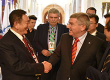 中国自行车运动协会主席崔大林向国际奥委会主席巴赫介绍 金沙js93252瑞豹自行车